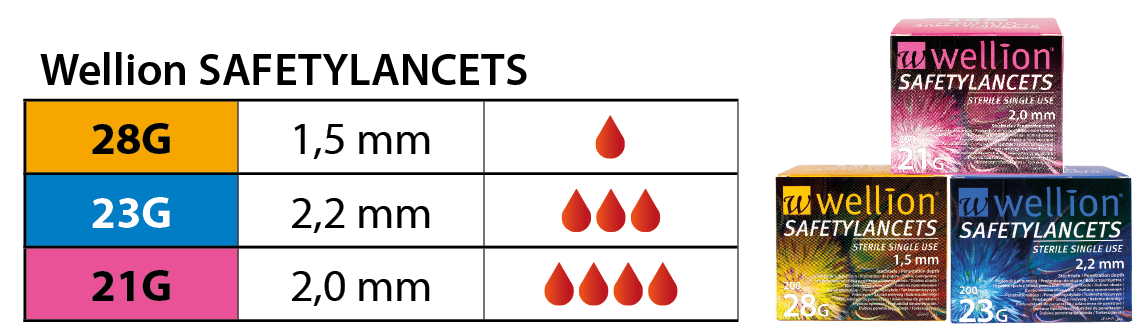 Wellion SAFETYLANCETS sigurnosne lancete imaju unaprijed određenu dubinu uboda, a lanceta je sigurno skrivena unutar kućišta. To je idealno za osobe s fobijom od igle, starije osobe, osobe sa smanjenim finomotoričkim sposobnostima ili sa problemima s vidom, jer nema potrebe za rukovanjem lancetarom.